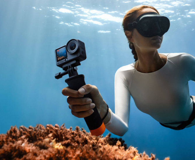 裸机防水,还原水下真实色彩 DJI Osmo Action 6 突破性地实现了20米裸机防水性能,无需额外防水壳即可应对绝大多数水下拍摄场景。这一设计不仅简化了拍摄准备流程,更避免了传统防水壳可能带来的画质损失,让水下影像保持原始清晰度。 相机内置的多光谱色温传感器和专业水压计构成了智能水下拍摄系统。色温传感器能精确感知不同水深的光线变化,自动校正因水介质导致的色彩偏差,真实还原珊瑚的艳丽色彩和鱼群的金属光泽。