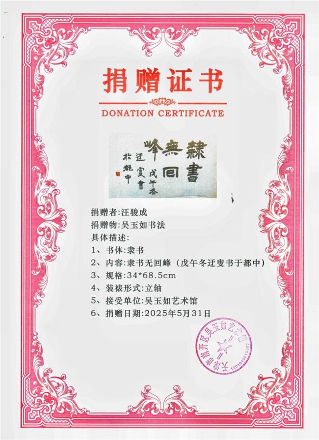 5月31日,捐赠仪式在南开大学吴玉如艺术馆隆重举行。汪骏成先生捐赠的这幅隶书作品创作于1978年,内容为《隶书无回锋》,是吴玉如先生晚年指导后辈学习隶书技艺的珍贵示范。作品以隶书书体书写,笔法严谨、结构工整,展现了吴玉如深厚的书法功底与艺术造诣。据国家文物局相关规定,吴玉如的隶书作品已被列为“禁止出境”的国宝级文物,其艺术价值与历史意义不言而喻。 吴玉如艺术馆馆长田正宪在捐赠仪式上表示:“吴玉如先生的隶书作品在传世作品中极为稀少,此次捐赠的《隶书无回锋》作品不仅是其书法技艺的直观体现,更为我们研究其隶书艺术的发展脉络、笔法特征提供了不可多得的实物资料,填补了行业研究的空白。”他强调,艺术馆将妥善保存并深入研究该作品,推动吴玉如书法艺术的学术探讨与文化传承。